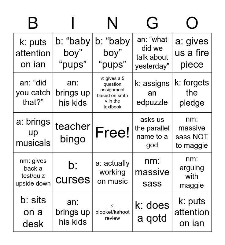 This bingo card has a free space and 51 words: k: does a qotd, k: puts attention on ian, k: assigns an edpuzzle, k: blooket/kahoot review, b: curses, b: sits on a desk, b: “baby boy” “pups”, b: hand sanitizer/wiping tables, an: “did you catch that?”, an: goes on a tangent not related to the lesson, an: brings up his kids, an: “what did we talk about yesterday”, nm: arguing with maggie, nm: massive sass, nm: gives back a test/quiz upside down, nm: hw from the textbook, v: gives a 5 question assignment based on smth v:in the textbook, asks us the parallel name to a god, a: brings up musicals, a: gives us a fire piece, teacher bingo, k: does a qotd, k: puts attention on ian, k: assigns an edpuzzle, k: blooket/kahoot review, k: everyone talking over morning announcements, k: forgets the pledge, b: curses, b: sits on a desk, b: “baby boy” “pups”, b: hand sanitizer/wiping tables, b: matching cardigan/dress combo, b: half a class of free time, an: “did you catch that?”, an: goes on a tangent not related to the lesson, an: brings up his kids, an: “what did we talk about yesterday”, an: yaps until the bell, an: brings up soccer/coaching, nm: arguing with maggie, nm: massive sass NOT to maggie, nm: gives back a test/quiz upside down, nm: hw from the textbook, nm: takes out big cards/big dice/rubiks cubes, nm: allows alana/maggie go to cutlers, a: roleplaying with students, a: brings up musicals, a: gives us a fire piece, a: half the class wasted yapping, a: actually working on music and a: beatles reference.