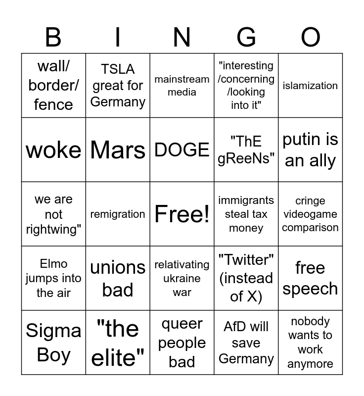 This bingo card has a free space and 24 words: unions bad, "the elite", DOGE, Sigma Boy, islamization, wall/ border/ fence, woke, TSLA great for Germany, immigrants steal tax money, relativating ukraine war, "ThE gReeNs", we are not rightwing", "Twitter" (instead of X), free speech, Mars, AfD will save Germany, cringe videogame comparison, mainstream media, putin is an ally, remigration, nobody wants to work anymore, Elmo jumps into the air, "interesting /concerning /looking into it" and queer people bad.
