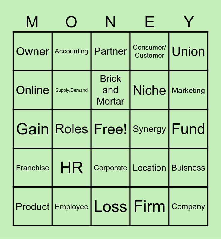 This bingo card has a free space and 44 words: Profit, Company, Entrepreneur, Product, Service, Firm, Partner, Position, Union, Employee, Consumer/ Customer, Synergy, Corporate, HR, Industry, Loss, Net, Gain, Advertising, Marketing, Accounting, Relations, CEO, Owner, Success, Fund, Shark Tank, Risk, Location, Franchise, Structure, Buisness, President, Board, Roles, Executive, Administration, Commercial, Brick and Mortar, Online, Niche, Direct, Supply/Demand and Contract.