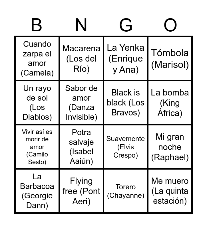This bingo card has 61 words: Maquillaje (Mecano), Clavaito (Chanel, Abraham Mateo), Juntos (Paloma San Basilio), Me muero (La quinta estación), Resistiré (Dúo Dinámico), Eres tú (Mocedades), Black is black (Los Bravos), Aquí no hay playa (The refrescos), Vivir así es morir de amor (Camilo Sesto), Como yo te amo (Rocío Jurado), Tómbola (Marisol), Canta y sé feliz (Peret), Sabor de amor (Danza Invisible), Olvídame y pega la vuelta (Pimpinela), Nochentera (Vicco), Cuando zarpa el amor (Camela), La Barbacoa (Georgie Dann), Un rayo de sol (Los Diablos), La ventanita del amor (Acuarela), La bomba (King África), Flying free (Pont Aeri), La Yenka (Enrique y Ana), Mediterrània (La Fúmiga), Cien gaviotas (Duncan Dhu), La camisa negra (Juanes), Chica Ye Ye (Concha Velasco), Yo quiero bailar (Sonia y Selena), Paquito el Chocolatero, Potra salvaje (Isabel Aaiún), Chiquilla (Seguridad Social), El baile del gorila (Melody), Mayonesa (Chocolate), Yes sir, I can boogie (Baccara), Levantando las manos (El símbolo), Macarena (Los del Río), Fiesta (Raffaella Carrà), Libre (Nino Bravo), Mi gran noche (Raphael), Que la detengan (David Civera), Suavemente (Elvis Crespo), Y nos dieron las diez (Joaquín Sabina), Escándalo (Raphael), Torero (Chayanne), No soy un superman (David Bustamante), Tractor amarillo (Zapato veloz), Campanera (Joselito), La Bilirrubina (Juan Luis Guerra), Me gustas mucho (Rocío Durcal), Ave María (David Bisbal), A quién le importa (Alaska), Este amor ya no se toca (Yuri), Color esperanza (Diego Torres), Corazón partío (Alejandro Sanz), Sarandonga (Lolita), Cuando tú vas (Chenoa), El chacachá del tren (El Consorcio), Eva María (Fórmula V), Te quiero más (Fórmula abierta), Vagabundo (Sebastián Yatra), Antes muerta que sencilla (María Isabel) and La vida es un carnaval (Celia Cruz).