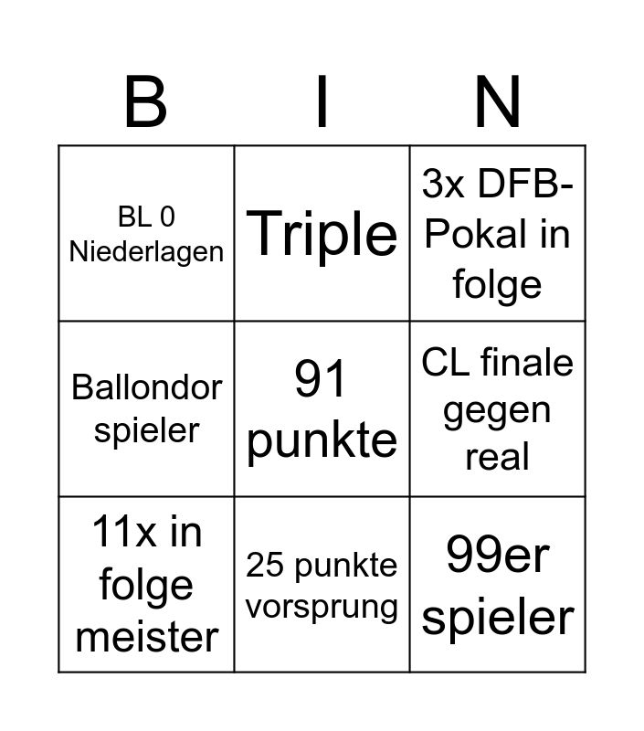 This bingo card has 9 words: 11x in folge meister, 3x DFB-Pokal in folge, Triple, Ballondor spieler, BL 0 Niederlagen, CL finale gegen real, 91 punkte, 99er spieler and 25 punkte vorsprung.