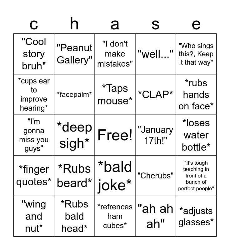 This bingo card has a free space and 24 words: *Rubs beard*, *Rubs bald head*, *Taps mouse*, "wing and nut", "Who sings this?, Keep it that way", "Cool story bruh", *cups ear to improve hearing*, "Peanut Gallery", "January 17th!", *bald joke*, *CLAP*, "I'm gonna miss you guys", "Cherubs", "It's tough teaching in front of a bunch of perfect people", *facepalm*, "ah ah ah", *loses water bottle*, "I don't make mistakes", *rubs hands on face*, *deep sigh*, *adjusts glasses*, *finger quotes*, "well..." and *refrences ham cubes*.