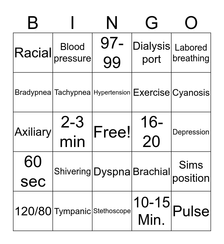 This bingo card has a free space and 24 words: Shivering, Tympanic, Hypertension, 120/80, Labored breathing, Racial, Bradypnea, Blood pressure, 16-20, Dyspna, Exercise, Axiliary, Brachial, Sims position, Tachypnea, 10-15 Min., Depression, 97-99, Cyanosis, 2-3 min, Pulse, 60 sec, Dialysis port and Stethoscope.