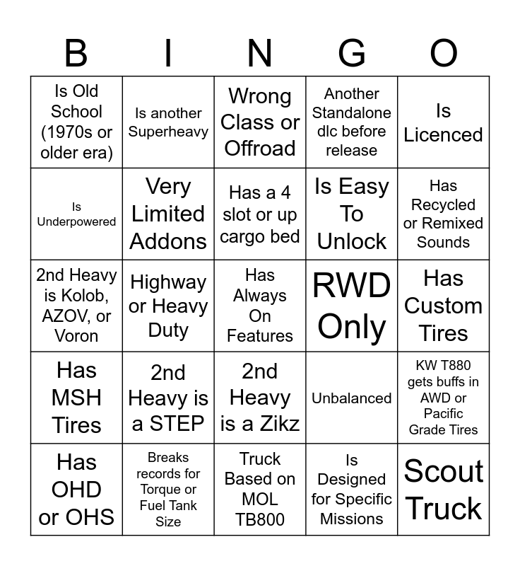 This bingo card has 25 words: Has MSH Tires, Breaks records for Torque or Fuel Tank Size, Has Always On Features, Is Designed for Specific Missions, Is Licenced, Is Old School (1970s or older era), Is another Superheavy, Wrong Class or Offroad, RWD Only, KW T880 gets buffs in AWD or Pacific Grade Tires, Is Underpowered, Very Limited Addons, Truck Based on MOL TB800, Unbalanced, Has Recycled or Remixed Sounds, Has OHD or OHS, Highway or Heavy Duty, Has a 4 slot or up cargo bed, Is Easy To Unlock, Has Custom Tires, 2nd Heavy is Kolob, AZOV, or Voron, 2nd Heavy is a STEP, 2nd Heavy is a Zikz, Another Standalone dlc before release and Scout Truck.