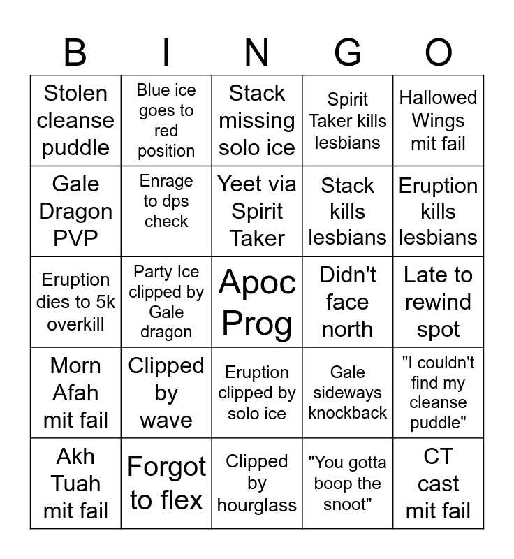 This bingo card has a free space and 24 words: Clipped by wave, Forgot to flex, Yeet via Spirit Taker, Akh Tuah mit fail, Hallowed Wings mit fail, Stolen cleanse puddle, Gale Dragon PVP, Blue ice goes to red position, Didn't face north, Eruption clipped by solo ice, Stack kills lesbians, Eruption dies to 5k overkill, Gale sideways knockback, "I couldn't find my cleanse puddle", Enrage to dps check, "You gotta boop the snoot", Late to rewind spot, Stack missing solo ice, Eruption kills lesbians, Party Ice clipped by Gale dragon, CT cast mit fail, Morn Afah mit fail, Spirit Taker kills lesbians and Clipped by hourglass.