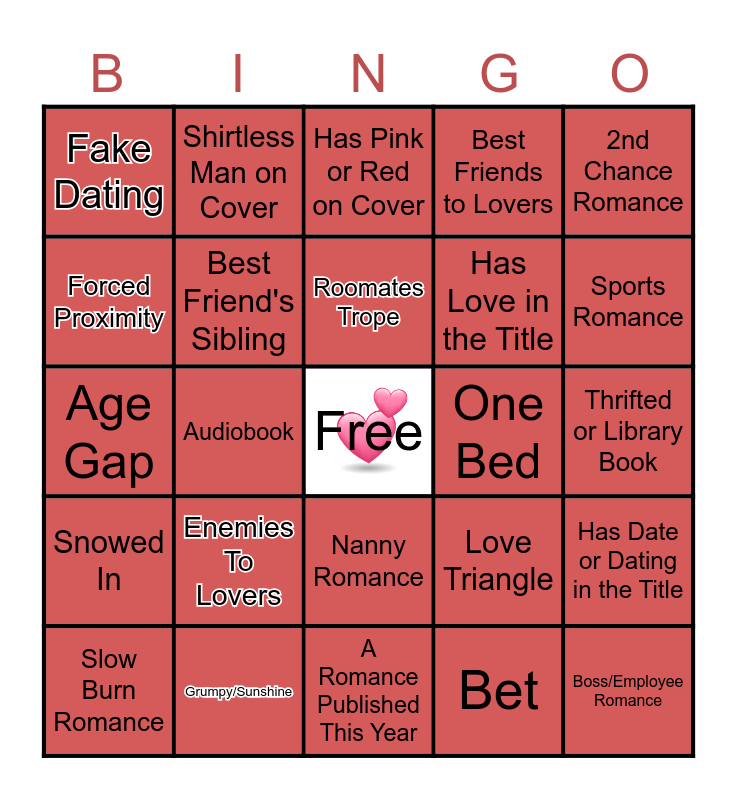 This bingo card has a free space and 24 words: Enemies To Lovers, Grumpy/Sunshine, Roomates Trope, Slow Burn Romance, 2nd Chance Romance, Fake Dating, Forced Proximity, Shirtless Man on Cover, One Bed, Nanny Romance, Has Love in the Title, Age Gap, Love Triangle, Has Date or Dating in the Title, Best Friend's Sibling, Bet, Thrifted or Library Book, Has Pink or Red on Cover, Sports Romance, Audiobook, Boss/Employee Romance, Snowed In, Best Friends to Lovers and A Romance Published This Year.