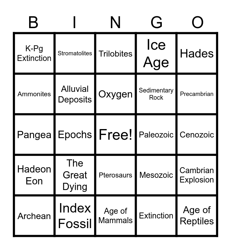 This bingo card has a free space and 34 words: Dinosaur, Extinction, Geologic Time Scale, Periods, Hadeon Eon, Alluvial Deposits, Hades, Archean, Stromatolites, Proterozoic, Oxygen, Trilobites, Phanerozoic, Aardvark, Paleozoic, Precambrian, Index Fossil, Pangea, The Great Dying, Mesozoic, Pterosaurs, Chicxulub Crater, K-Pg Extinction, Cenozoic, Age of Mammals, Age of Reptiles, Ice Age, Megafauna, Sedimentary Rock, Ammonites, Nicolas Steno, Epochs, Cambrian Explosion and Amphibians.