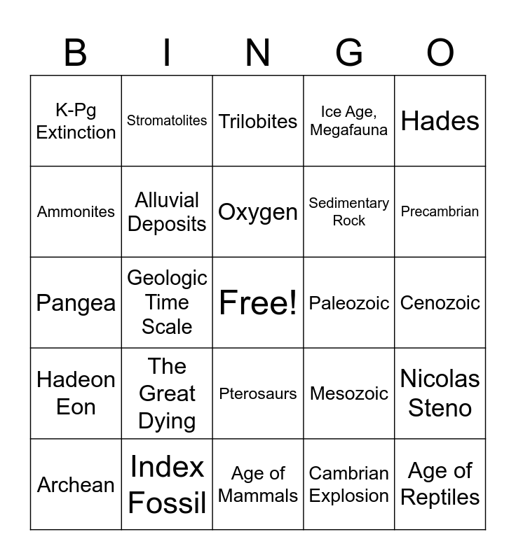 This bingo card has a free space and 33 words: Dinosaur, Extinction, Geologic Time Scale, Periods, Hadeon Eon, Alluvial Deposits, Hades, Archean, Stromatolites, Proterozoic, Oxygen, Trilobites, Phanerozoic, Aardvark, Paleozoic, Precambrian, Index Fossil, Pangea, The Great Dying, Mesozoic, Pterosaurs, Chicxulub Crater, K-Pg Extinction, Cenozoic, Age of Mammals, Age of Reptiles, Ice Age, Megafauna, Sedimentary Rock, Ammonites, Nicolas Steno, Epochs, Cambrian Explosion and Amphibians.