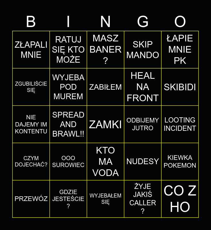 This bingo card has 25 words: OOO SUROWIEC, WYJEBAŁEM SIĘ, ZABIŁEM, PRZEWÓZ, ŁAPIE MNIE PK, ZŁAPALI MNIE, ZGUBILIŚCIE SIĘ, RATUJ SIĘ KTO MOŻE, ODBIJEMY JUTRO, KTO MA VODA, HEAL NA FRONT, NIE DAJEMY IM KONTENTU, NUDESY, KIEWKA POKEMON, WYJEBA POD MUREM, CO Z HO, LOOTING INCIDENT, MASZ BANER ?, SKIBIDI, SPREAD AND BRAWL!!, ZAMKI, GDZIE JESTEŚCIE ?, CZYM DOJECHAĆ?, SKIP MANDO and ŻYJE JAKIŚ CALLER ?.