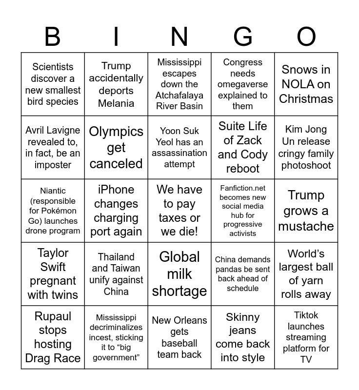 This bingo card has a free space and 24 words: Thailand and Taiwan unify against China, Mississippi decriminalizes incest, sticking it to “big government”, Yoon Suk Yeol has an assassination attempt, Rupaul stops hosting Drag Race, Snows in NOLA on Christmas, Scientists discover a new smallest bird species, Avril Lavigne revealed to, in fact, be an imposter, Trump accidentally deports Melania, Fanfiction.net becomes new social media hub for progressive activists, Global milk shortage, Suite Life of Zack and Cody reboot, Niantic (responsible for Pokémon Go) launches drone program, China demands pandas be sent back ahead of schedule, World’s largest ball of yarn rolls away, Olympics get canceled, Skinny jeans come back into style, Trump grows a mustache, Mississippi escapes down the Atchafalaya River Basin, Kim Jong Un release cringy family photoshoot, iPhone changes charging port again, Tiktok launches streaming platform for TV, Taylor Swift pregnant with twins, Congress needs omegaverse explained to them and New Orleans gets baseball team back.