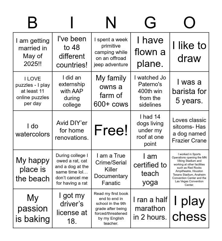 This bingo card has a free space and 145 words: Love to paint in my free time (amateur artist), Favorite vacations are cruising with the family, I am a big DIY crafter, I am the oldest of 5 and only girl, My father’s family was featured in the National Geographic magazine, I am certified to teach yoga, I have a white cat, Got my very first tattoo on my 52nd birthday - it was a gift from my daughter, 80's hairbands are my favorite and are my most listened to playlists on Spotify, Born and bred on Long Island, NY - but have been in GA for 17 years now, Love relieving stress by hitting the punching bag (kickboxing), Seeing the northern lights is on my bucket list and may finally go to Iceland to see them this year 2025 ( fingers crossed), loves to do country or different landscape crossword puzzles on days off, Wants to own a horse, alpacas and pig farm, Named after a Cabbage patch doll, Donates art work to help raise money for non profits for women and children, Played saxophone in high school band, Once won a city 3 on 3 basketball championship, I’m a PADI certified advanced scuba diver., I completed an Ironman 70.3 in 2021., I was the Captain of the Fly Fishing team while in college at Clemson, I worked in Sports Operations opening the MN Viking Stadium and working at other facilities such as Red Rocks Ampitheatre, Houston Texans Stadium, Anaheim Convention Center and the Las Vegas Convention Center., I am 1 of 12 siblings, 2024 I watched 9 of the 16 SEC football teams play live, Have my PADI certification for rescue scuba diving., Avid DIY’er for home renovations., I've been to 48 different countries!, I taught winter skiing for 14 years!, She's an only child., Her favorite food is Italian style chicken cutlets., She has over 100 pairs of sneakers., She's the oldest of 5, Loves to sing and paint, Loves classic sitcoms- Has a dog named Frazier Crane, Painting is how she vibes out, Favorite thing to do is attend Rock Concerts, Jumping out of planes was once in my job description, I coach high school basketball, I watched Jo Paterno's 400th win from the sidelines, My child and my dog are named after the 16th president, My favorite sport to watch is UFC, I was a wedding singer to pay for college, I am a True Crime/Serial Killer Documentary Fanatic, I have a 23 pound Tuxedo Cat, I played Basketball and Soccer through college, I have visited 41 countries, My favorite food is Thai and have it at least once or twice a week., I am a big Minnesota Vikings fan, Most days I'd prefer to eat dessert rather than dinner, I crochet baby blankets for friends expecting their first child, I grew up in Jamaica, I used to be a ski instructor, My passion is baking, I once had Keith Sweat serenade me while sitting on my lap., I love travelling and have been to 20 countries., Gold medalist rhythmic gymnast, competed internationally., Played the clarinet for 7 years, I ran into AJ from Backstreet Boys while shopping, I used to compete in horseback riding., I am a grandmother of 3, I spent a week primitive camping while on an offroad jeep adventure, Give me the beach over the mountains, I am the queen of my castle #boy mom, I almost hit my favorite drummer with my car., I like to hike in my free time., I had 14 dogs living under my roof at one point, My happy place is the beach, I have been to the top of the Eiffel Tower, Purple is my favorite color, I plan to go to Switzerland for my next milestone birthday, I love action and thriller movies, I speak French, I am getting married in May of 2025!!, My 115lb furbaby has his own temper pedic pillow he sleeps on at night, I broke 3 ribs in a softball game in high school., I have a collection of German Cuckoo clocks., I cannot walk on a bare floor with no shoes on., I am a huge fan of documentaries, murder, or missing persons., I won my middle school spelling bee., I have flown a plane., My name means gift, present, or benefit in Arabic., I spend my free time with family and self-development., I love horror movies, I enjoy quilting, I have 2 daughters., I used to have a recreational pilots license., I have 2 cats named after The Godfather, Fredo & Santino, During college, I spent a semester in Paris and worked backstage at Paris Fashion Week, Was on the wall at a Seafood Restaurant in Myrtle Beach, SC for 3 years for eating 18 plates of crab legs., Read my first book end to end in school in the 9th grade after being forced/threatened by my English teacher., Dream car is a C8 corvette, Played saxophone in a city symphonic band, I have 3 siblings, I was born on a Military Base, I got my driver’s license at 18., I hold citizenship in two countries., I have 1 sibling, I have a fish tank, I do watercolors, I track migratory bird deaths in the city for the Urban Ecology Center, I've watched pretty much every 90s sitcom several times through, I LOVE puzzles - I play at least 11 online puzzles per day, I have a degree in Cellular and Molecular Bio, I once sat 8.5 hours for a tattoo, I’ve don’t crossfit for 3 years, My family owns a farm of 600+ cows, I have been to Disney World over 23 Times, I have been to wrestlemania, I was a theater kid., I am very creative., I grew up doing soccer, track and field, dance, and marching band/ band, During college I owed a rat, cat and a dog at the same time lol… don’t cancel me for having a rat, I was down bad when I got him., I was a barista for 5 years., I was 21 when I got engaged., I play chess, I like to draw, My blood DNA has changed in my lifetime, I played tennis with a record winning Tennis Player, I do not like seafood., I am the middle child., I speak 3 languages: English, Spanish, ASL (American Sign Language), I am the only girl of four children., I used to work in a haunted house., I ran a half marathon in 2 hours., Love diet coke (easy give away 😉), Hometown in Virginia, I married a Mariachi, so I get serenaded whenever I want., I love peanut brittle., I go to Disney once every year since I was 5yo, I got a