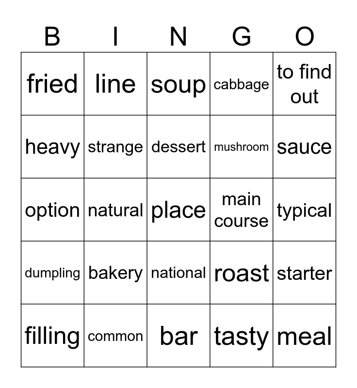 This bingo card has a free space and 24 words: bakery, common, dessert, filling, to find out, fried, heavy, line, main course, national, mushroom, option, roast, starter, strange, tasty, typical, soup, sauce, natural, meal, dumpling, cabbage and bar.