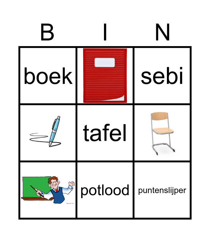 This bingo card has 14 images and 33 words: Free!, pen, potlood, gum, tas, tafel, stoel, schrift, boek, puntenslijper, liniaal, juf, meester, verf, kwast, lijm, mohamed, mohammad, taimaa, maysaa, reem, abdulhakim, skye, mohab, melike, jana, wayon, sebi, hamza, hanan, monique, jane and taalklas 1.
