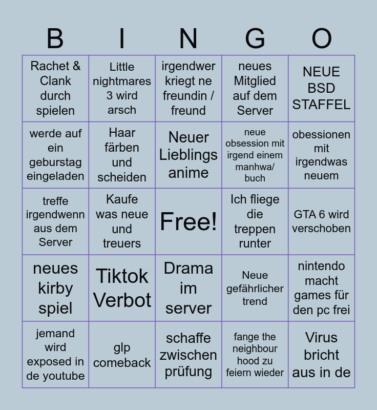 This bingo card has a free space and 24 words: Tiktok Verbot, glp comeback, Neuer Lieblings anime, jemand wird exposed in de youtube, NEUE BSD STAFFEL, Rachet & Clank durch spielen, werde auf ein geburstag eingeladen, Little nightmares 3 wird arsch, Ich fliege die treppen runter, Drama im server, neue obsession mit irgend einem manhwa/ buch, treffe irgendwenn aus dem Server, Neue gefährlicher trend, nintendo macht games für den pc frei, Haar färben und scheiden, fange the neighbour hood zu feiern wieder, GTA 6 wird verschoben, irgendwer kriegt ne freundin / freund, obessionen mit irgendwas neuem, Kaufe was neue und treuers, Virus bricht aus in de, neues kirby spiel, neues Mitglied auf dem Server and schaffe zwischen prüfung.