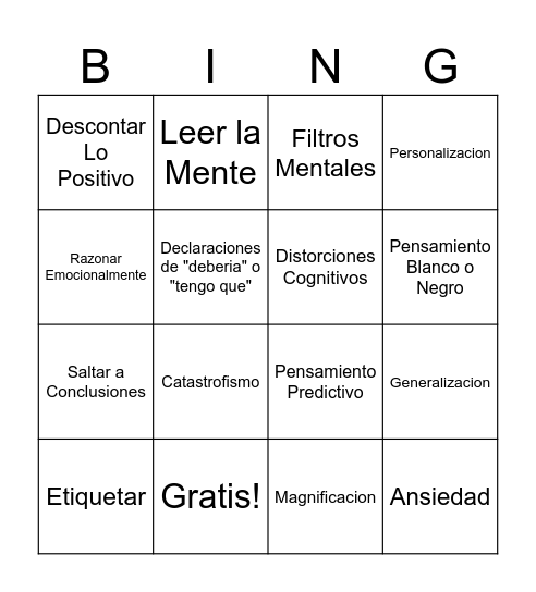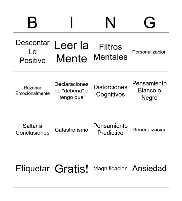 This bingo card has 16 words: Gratis!, Generalizacion, Filtros Mentales, Descontar Lo Positivo, Saltar a Conclusiones, Leer la Mente, Pensamiento Predictivo, Magnificacion, Razonar Emocionalmente, Declaraciones de "deberia" o "tengo que", Etiquetar, Personalizacion, Catastrofismo, Pensamiento Blanco o Negro, Distorciones Cognitivos and Ansiedad.