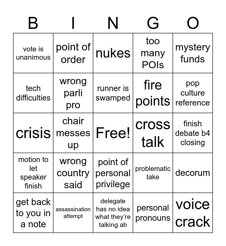 This bingo card has a free space and 24 words: wrong country said, assassination attempt, runner is swamped, get back to you in a note, mystery funds, vote is unanimous, tech difficulties, point of order, cross talk, point of personal privilege, fire points, crisis, problematic take, decorum, wrong parli pro, personal pronouns, finish debate b4 closing, nukes, pop culture reference, chair messes up, voice crack, motion to let speaker finish, too many POIs and delegate has no idea what they’re talking ab.