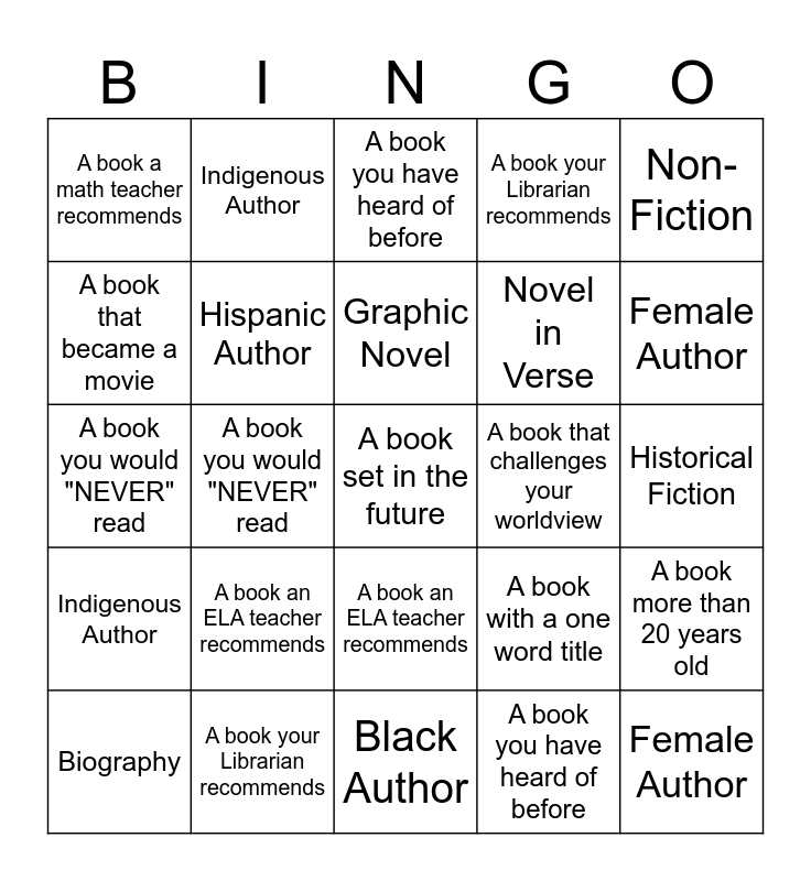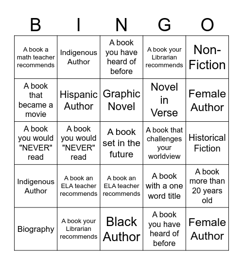 ⚠ This card has duplicate items: Female Author (2), Biography (2), Black Author (2), A book an ELA teacher recommends (2), Indigenous Author (2), A book with a number in the title (2), A book that became a movie (2), Mystery (2), Hispanic Author (2), A book your Librarian recommends (2), A book more than 20 years old (2), A book with a one word title (2), Historical Fiction (2), Romance (2), Graphic Novel (2), A book that challenges your worldview (2), A book on display (2), Non-Fiction (2), A book you would "NEVER" read (2), A book you have heard of before (2), A book a math teacher recommends (2), Novel in Verse (2), A book with an LGBTQ character (2)