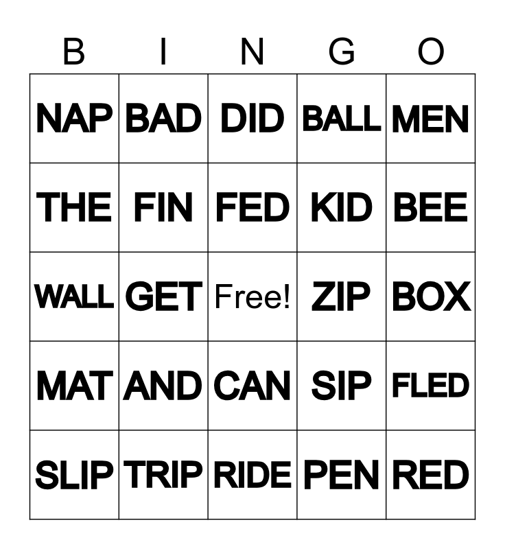 This bingo card has a free space and 29 words: SLIP, BAT, GET, RUN, NAP, DID, FIN, AND, ZIP, TRIP, BOX, RED, RIDE, PEN, BEE, PINK, CAN, MAT, MEN, WALL, SIP, DRIP, KID, THE, BALL, BAD, FLED, FED and RAT.