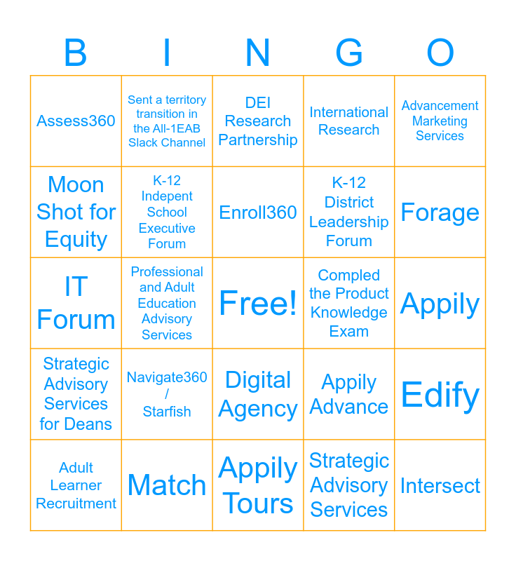 This bingo card has a free space and 24 words: Adult Learner Recruitment, Navigate360 / Starfish, Enroll360, Strategic Advisory Services, Advancement Marketing Services, Assess360, Sent a territory transition in the All-1EAB Slack Channel, DEI Research Partnership, Compled the Product Knowledge Exam, Appily, IT Forum, K-12 Indepent School Executive Forum, Appily Advance, Edify, Moon Shot for Equity, Match, Appily Tours, International Research, Forage, Strategic Advisory Services for Deans, Professional and Adult Education Advisory Services, Digital Agency, K-12 District Leadership Forum and Intersect.