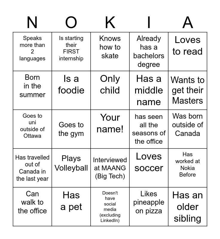 This bingo card has a free space and 24 words: Can walk to the office, Plays Volleyball, Only child, Likes pineapple on pizza, Loves to read, Speaks more than 2 languages, Is starting their FIRST internship, Knows how to skate, has seen all the seasons of the office, Was born outside of Canada, Goes to uni outside of Ottawa, Is a foodie, Loves soccer, Has worked at Nokia Before, Born in the summer, Has a pet, Doesn't have social media (excluding LinkedIn), Already has a bachelors degree, Wants to get their Masters, Has travelled out of Canada in the last year, Goes to the gym, Interviewed at MAANG (Big Tech), Has a middle name and Has an older sibling.