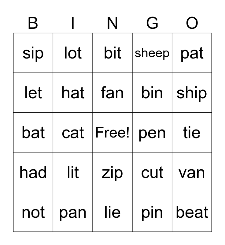 This bingo card has a free space and 24 words: lit, pan, fan, not, pat, sip, let, lot, pen, zip, bin, bat, cut, van, hat, pin, tie, bit, ship, cat, beat, had, sheep and lie.