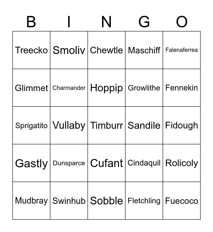 This bingo card has a free space and 24 words: Dunsparce, Swinhub, Hoppip, Mudbray, Falenaferrea, Treecko, Glimmet, Smoliv, Sandile, Cufant, Growlithe, Sprigatito, Cindaquil, Rolicoly, Charmander, Fletchling, Fidough, Chewtle, Fennekin, Vullaby, Fuecoco, Gastly, Maschiff and Sobble.