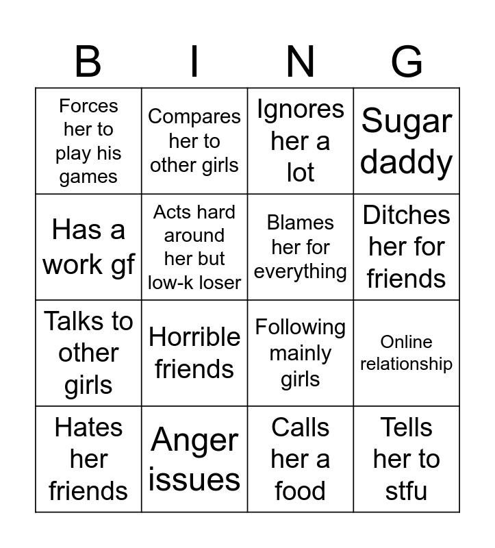 This bingo card has 16 words: Anger issues, Online relationship, Ignores her a lot, Forces her to play his games, Talks to other girls, Compares her to other girls, Following mainly girls, Calls her a food, Has a work gf, Acts hard around her but low-k loser, Hates her friends, Sugar daddy, Horrible friends, Ditches her for friends, Blames her for everything and Tells her to stfu.