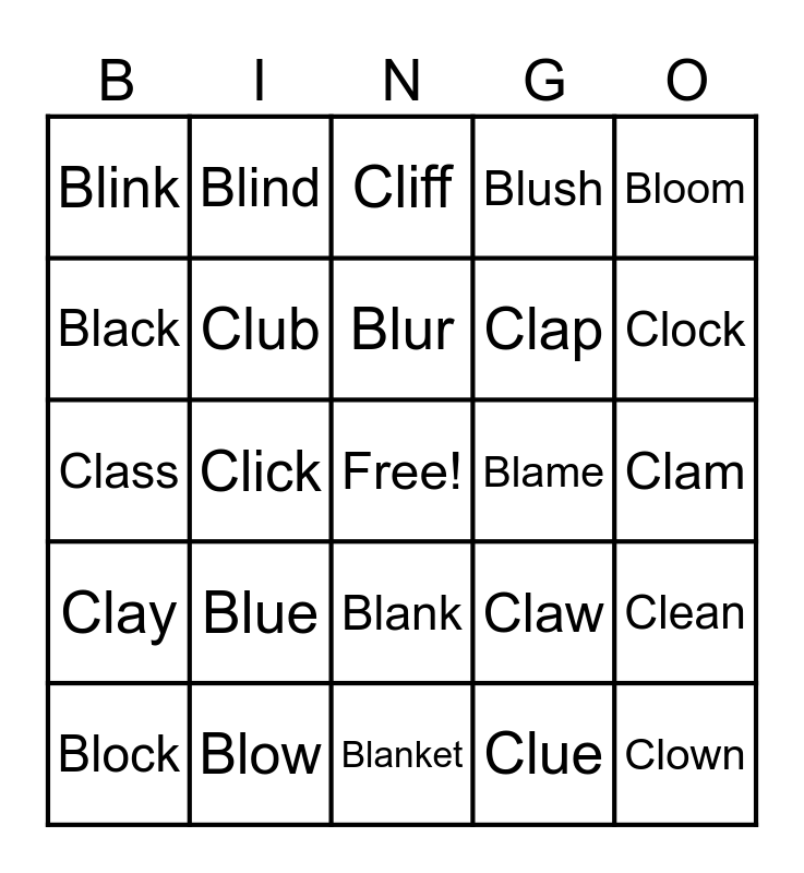 This bingo card has a free space and 24 words: Blue, Blow, Blur, Block, Bloom, Blink, Black, Blind, Blame, Blank, Clap, Class, Claw, Clean, Club, Clue, Clam, Cliff, Clock, Click, Clown, Clay, Blush and Blanket.