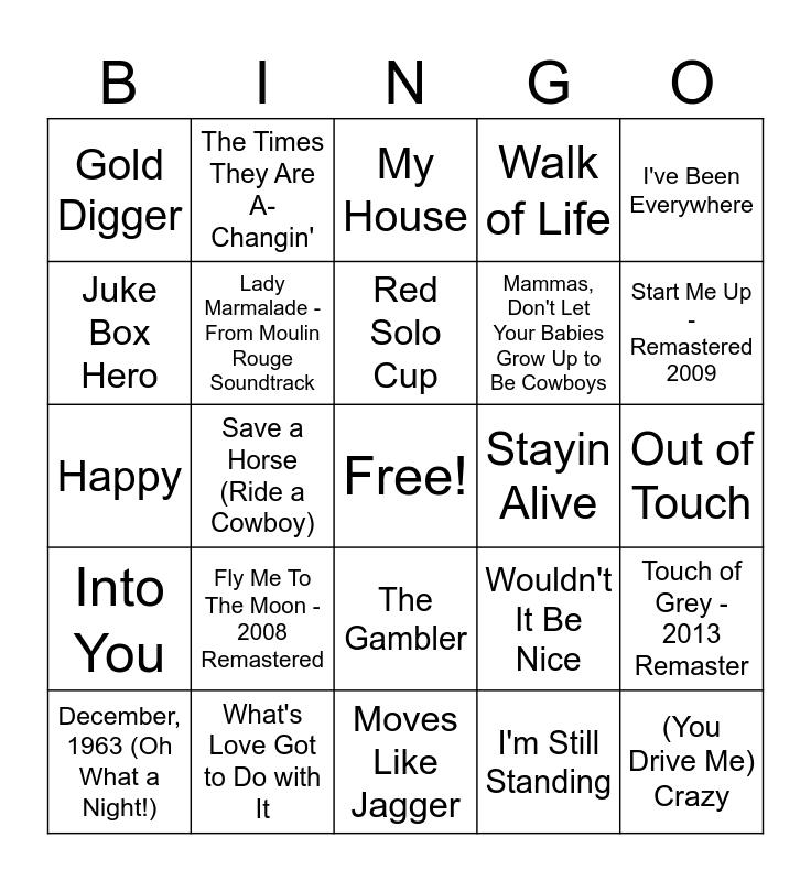 This bingo card has a free space and 92 words: Old Time Rock And Roll, Just A Girl, Moves Like Jagger, Bad Guy, American Woman, Drop It Like It's Hot, Take Me Home, Country Roads, December, 1963 (Oh What a Night!), Roar, Have You Ever Seen The Rain, Rhythm Nation, Everybody (Backstreet's Back), ...Ready For It?, Mammas, Don't Let Your Babies Grow Up to Be Cowboys, Livin' On A Prayer, I've Been Everywhere, My House, I Like It, Pink Houses, Music, Uptown Funk (feat. Bruno Mars), Jump, Whatever It Takes, Born This Way, Fly Me To The Moon - 2008 Remastered, Lady Marmalade - From Moulin Rouge Soundtrack, Don't You (Forget About Me), What Do You Mean?, Mr. Jones, Dancing In the Dark, What's Love Got to Do with It, The Gambler, Imma Be, What's Up?, The Times They Are A-Changin', Timber, Eye of the Tiger, Ride, Red Solo Cup, Wouldn't It Be Nice, Happy, Into You, Out of Touch, Blue (Da Ba Dee) - Gabry Ponte Ice Pop Radio, (You Drive Me) Crazy, The Devil Went Down to Georgia, Hypnotize - 2007 Remaster, Mambo No. 5 (a Little Bit of...), Whole Lotta Love - 1990 Remaster, I Will Wait, Dance The Night - From Barbie The Album, Elvira, Starboy, If I Had $1,000,000, Lovely Day, Rolling in the Deep, You Make Me Feel... (feat. Sabi), Juke Box Hero, good 4 u, Save a Horse (Ride a Cowboy), Thunderstruck, So What, Party Rock Anthem, Smooth Criminal - 2012 Remaster, Circles, I'm Still Standing, Chattahoochee, I Saw Her Standing There - Remastered 2009, Beautiful Day, It's Still Rock and Roll to Me, Jailhouse Rock, CAN'T STOP THE FEELING! (from DreamWorks Animation's TROLLS), Walk of Life, Hips Don't Lie (feat. Wyclef Jean), Mercy Mercy Me (The Ecology) - Mono Single Version, Truth Hurts, Touch of Grey - 2013 Remaster, Single Ladies (Put a Ring on It), Party In The U.S.A., Every Little Thing She Does Is Magic, As It Was, Stayin Alive, Gold Digger, Under the Bridge, A Bar Song (Tipsy), We Will Rock You - Remastered 2011, Ironic, Signed, Sealed, Delivered (I'm Yours), Smooth Operator - Single Version, Shape of You, Start Me Up - Remastered 2009 and One Love / People Get Ready.
