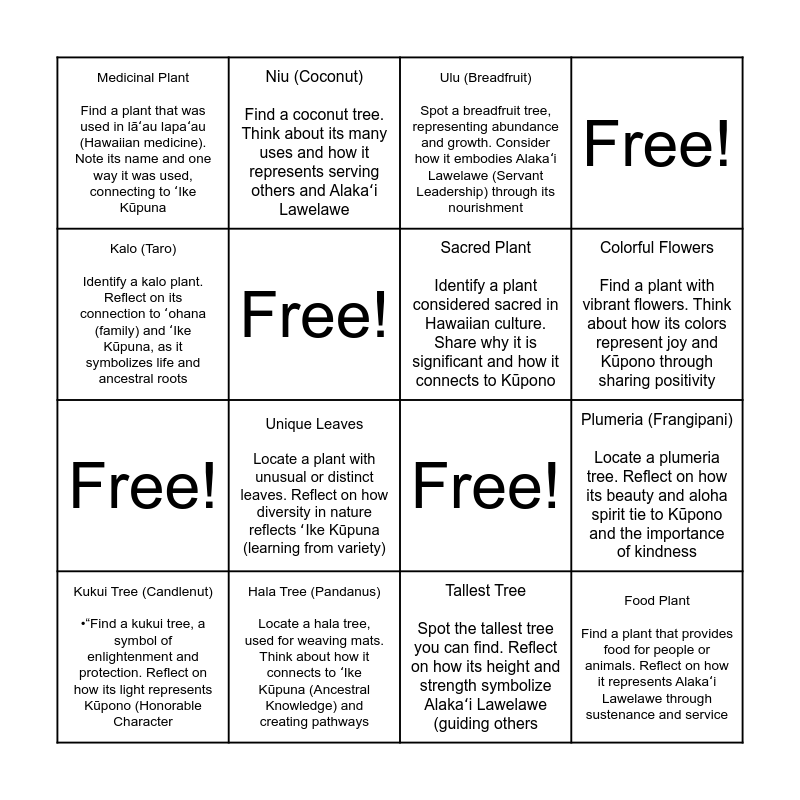 This bingo card has 16 words: Kukui Tree (Candlenut) •“Find a kukui tree, a symbol of enlightenment and protection. Reflect on how its light represents Kūpono (Honorable Character, Hala Tree (Pandanus) Locate a hala tree, used for weaving mats. Think about how it connects to ʻIke Kūpuna (Ancestral Knowledge) and creating pathways, Ulu (Breadfruit) Spot a breadfruit tree, representing abundance and growth. Consider how it embodies Alakaʻi Lawelawe (Servant Leadership) through its nourishment, Free!, Kalo (Taro) Identify a kalo plant. Reflect on its connection to ʻohana (family) and ʻIke Kūpuna, as it symbolizes life and ancestral roots, Niu (Coconut) Find a coconut tree. Think about its many uses and how it represents serving others and Alakaʻi Lawelawe, Free!, Plumeria (Frangipani) Locate a plumeria tree. Reflect on how its beauty and aloha spirit tie to Kūpono and the importance of kindness, Medicinal Plant Find a plant that was used in lāʻau lapaʻau (Hawaiian medicine). Note its name and one way it was used, connecting to ʻIke Kūpuna, Free!, Tallest Tree Spot the tallest tree you can find. Reflect on how its height and strength symbolize Alakaʻi Lawelawe (guiding others, Colorful Flowers Find a plant with vibrant flowers. Think about how its colors represent joy and Kūpono through sharing positivity, Free!, Unique Leaves Locate a plant with unusual or distinct leaves. Reflect on how diversity in nature reflects ʻIke Kūpuna (learning from variety), Sacred Plant Identify a plant considered sacred in Hawaiian culture. Share why it is significant and how it connects to Kūpono and Food Plant Find a plant that provides food for people or animals. Reflect on how it represents Alakaʻi Lawelawe through sustenance and service.