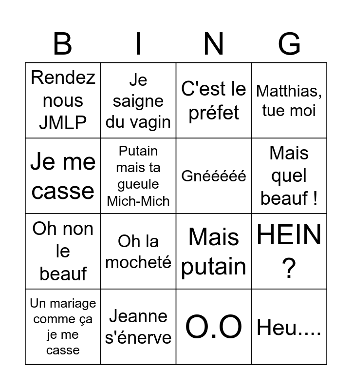 This bingo card has 16 words: Jeanne s'énerve, HEIN ?, C'est le préfet, Rendez nous JMLP, Oh non le beauf, Je saigne du vagin, Mais putain, O.O, Je me casse, Putain mais ta gueule Mich-Mich, Un mariage comme ça je me casse, Matthias, tue moi, Oh la mocheté, Mais quel beauf !, Gnééééé and Heu.....
