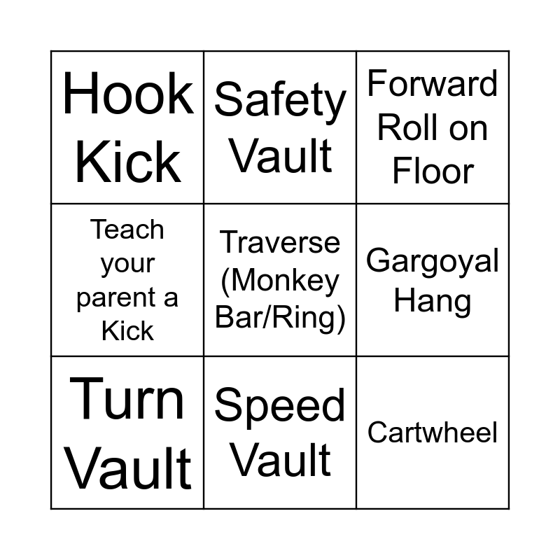 This bingo card has a free space and 8 words: Gargoyal Hang, Forward Roll on Floor, Safety Vault, Turn Vault, Hook Kick, Cartwheel, Teach your parent a Kick and Speed Vault.