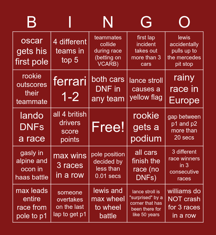This bingo card has a free space and 24 words: max wins 3 races in a row, someone overtakes on the last lap to get p1, both cars DNF in any team, max leads entire race from pole to p1, lewis accidentally pulls up to the mercedes pit stop, oscar gets his first pole, rookie outscores their teammate, 4 different teams in top 5, rookie gets a podium, pole position decided by less than 0.01 secs, lance stroll causes a yellow flag, lando DNFs a race, all cars finish the race (no DNFs), 3 different race winners in 3 consecutive races, ferrari 1-2, lance stroll is "surprised" by a corner that has been there for like 50 years, gap between p1 and p2 more than 20 secs, teammates collide during race (betting on VCARB), rainy race in Europe, all 4 british drivers score points, williams do NOT crash for 3 races in a row, gasly in alpine and ocon in haas battle, first lap incident takes out more than 3 cars and lewis and max wheel to wheel battle.