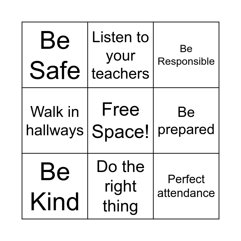 This bingo card has a free space and 8 words: Be prepared, Be Responsible, Listen to your teachers, Be Kind, Be Safe, Perfect attendance, Walk in hallways and Do the right thing.