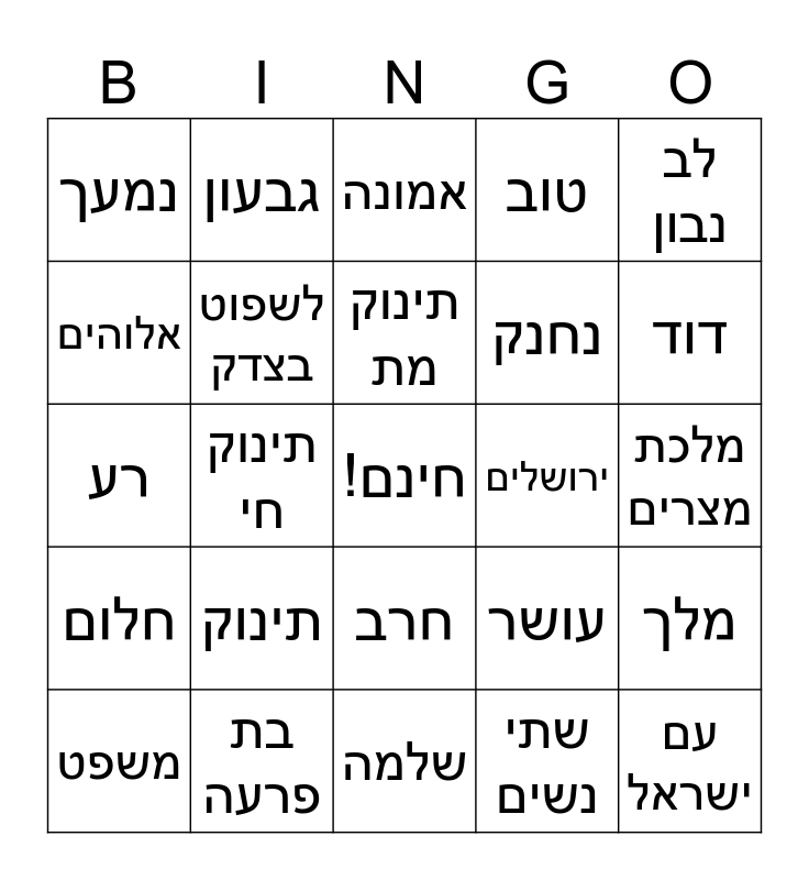 This bingo card has a free space and 25 words: תינוק, שלמה, תינוק מת, משפט, לב נבון, נמעך, אלוהים, גבעון, ירושלים, חרב, נחנק, רע, עושר, מלך, לשפוט בצדק, כבוד, מלכת מצרים, אמונה, דוד, תינוק חי, עם ישראל, בת פרעה, חלום, טוב and שתי נשים.