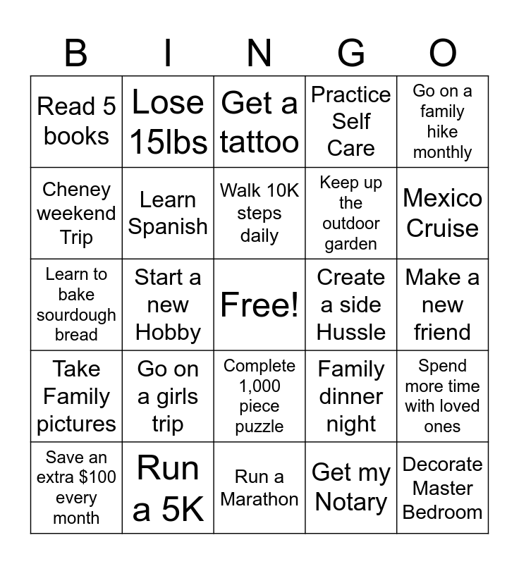 This bingo card has a free space and 24 words: Go on a girls trip, Run a 5K, Walk 10K steps daily, Save an extra $100 every month, Go on a family hike monthly, Read 5 books, Cheney weekend Trip, Lose 15lbs, Create a side Hussle, Complete 1,000 piece puzzle, Keep up the outdoor garden, Learn to bake sourdough bread, Family dinner night, Spend more time with loved ones, Learn Spanish, Get my Notary, Make a new friend, Get a tattoo, Mexico Cruise, Start a new Hobby, Decorate Master Bedroom, Take Family pictures, Practice Self Care and Run a Marathon.