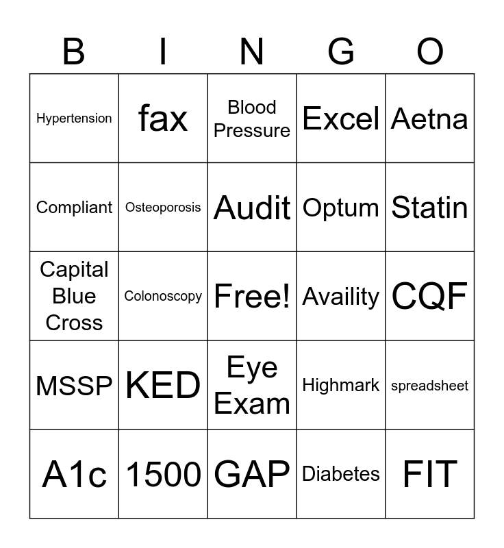 This bingo card has a free space and 29 words: A1c, Mammogram, Colonoscopy, FOBT, Hypertension, Blood Pressure, Osteoporosis, KED, Availity, 1500, CQF, FIT, GAP, Diabetes, Statin, Epic, Eye Exam, MSSP, Aetna, Capital Blue Cross, Highmark, Highmark Wholecare, Optum, Compliant, Excel, fax, spreadsheet, Audit and Computer.