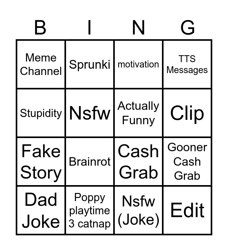 This bingo card has 16 words: Poppy playtime 3 catnap, Gooner Cash Grab, motivation, Meme Channel, Fake Story, Sprunki, Cash Grab, Nsfw (Joke), Stupidity, Nsfw, Dad Joke, TTS Messages, Brainrot, Clip, Actually Funny and Edit.