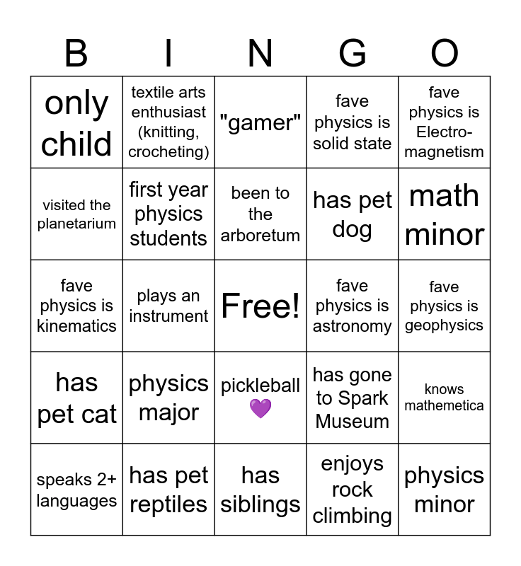 This bingo card has a free space and 24 words: physics major, has pet reptiles, been to the arboretum, speaks 2+ languages, fave physics is Electro-magnetism, only child, visited the planetarium, textile arts enthusiast (knitting, crocheting), fave physics is astronomy, pickleball 💜, has pet dog, fave physics is kinematics, has gone to Spark Museum, knows mathemetica, first year physics students, enjoys rock climbing, fave physics is geophysics, "gamer", math minor, plays an instrument, physics minor, has pet cat, fave physics is solid state and has siblings.