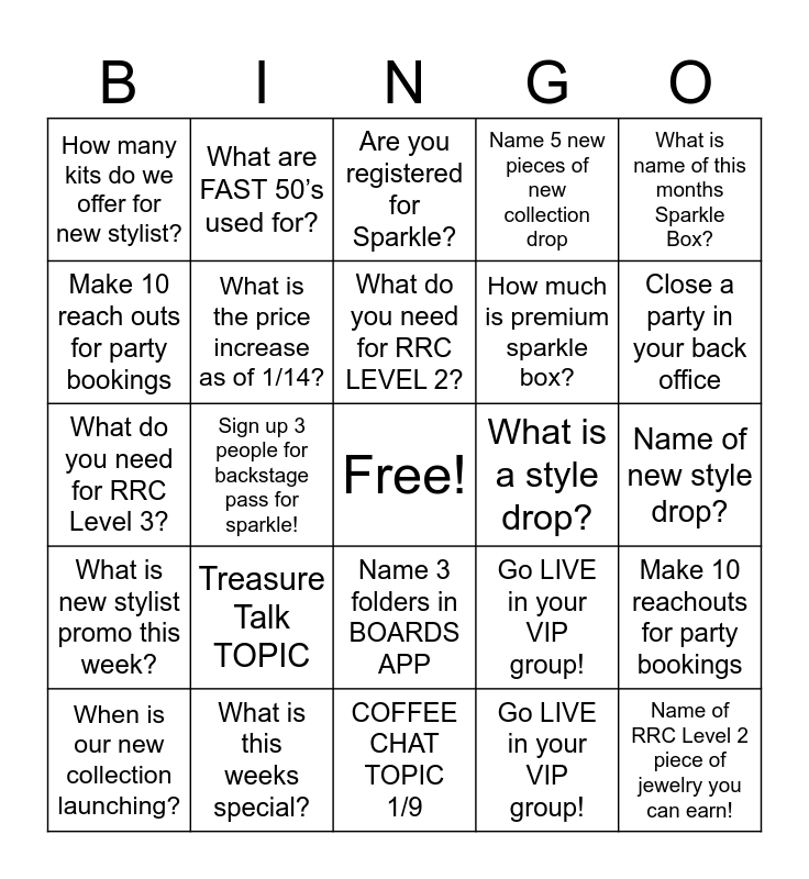 This bingo card has a free space and 24 words: Treasure Talk TOPIC, What is this weeks special?, What do you need for RRC LEVEL 2?, When is our new collection launching?, What is name of this months Sparkle Box?, How many kits do we offer for new stylist?, Make 10 reach outs for party bookings, What are FAST 50’s used for?, What is a style drop?, Name 3 folders in BOARDS APP, How much is premium sparkle box?, What do you need for RRC Level 3?, Go LIVE in your VIP group!, Make 10 reachouts for party bookings, What is the price increase as of 1/14?, Go LIVE in your VIP group!, Name of new style drop?, Are you registered for Sparkle?, Close a party in your back office, Sign up 3 people for backstage pass for sparkle!, Name of RRC Level 2 piece of jewelry you can earn!, What is new stylist promo this week?, Name 5 new pieces of new collection drop and COFFEE CHAT TOPIC 1/9.