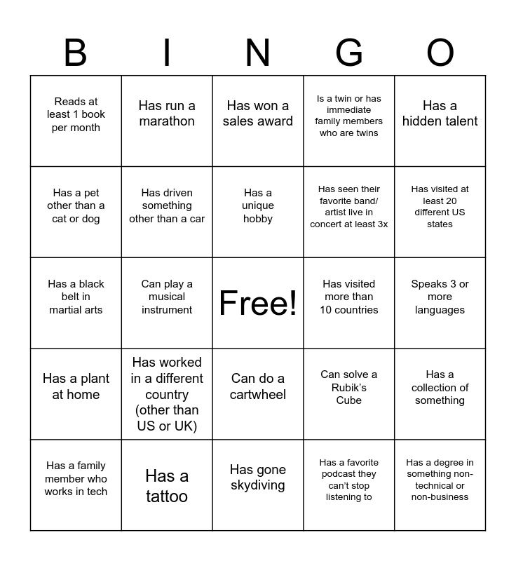 This bingo card has a free space and 24 words: Has worked in a different country (other than US or UK), Has a tattoo, Has a unique hobby, Has a family member who works in tech, Has a hidden talent, Reads at least 1 book per month, Has a pet other than a cat or dog, Has run a marathon, Has visited more than 10 countries, Can do a cartwheel, Has seen their favorite band/ artist live in concert at least 3x, Has a black belt in martial arts, Can solve a Rubik’s Cube, Has a collection of something, Has driven something other than a car, Has a favorite podcast they can’t stop listening to, Speaks 3 or more languages, Has won a sales award, Has visited at least 20 different US states, Can play a musical instrument, Has a degree in something non-technical or non-business, Has a plant at home, Is a twin or has immediate family members who are twins and Has gone skydiving.