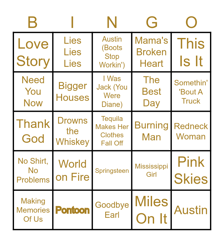 This bingo card has a free space and 54 words: I Drive Your Truck, No Shirt, No Problems, Bless The Broken Road, Wagon Wheel, Springsteen, Chicken Fried, Mama's Broken Heart, If I Die Young, Need You Now, Whiskey Lullaby, Love Story, Cruise, Pontoon, Making Memories Of Us, Picture, Goodbye Earl, Austin, The Best Day, I Love This Bar, Redneck Woman, Mississippi Girl, Beautiful Crazy, Burning Man, This Is It, Starting Over, Lies Lies Lies, Chevrolet, Lonely Road, Drive, Miles On It, I Am Not Okay, All-American Girl, Body Like A Back Road, These Are My People, Austin (Boots Stop Workin'), A Bar Song, Thank God, Pink Skies, Darlin', Bigger Houses, Save A Horse, Cruel Summer, TRUCK BED, Pour Me A Drink, World on Fire, The Painter, Meant to Be, Everythings Gonna Be Alright, I Was Jack (You Were Diane), Drowns the Whiskey, Somethin' 'Bout A Truck, Buy Dirt, Shallow and Memory Lane.