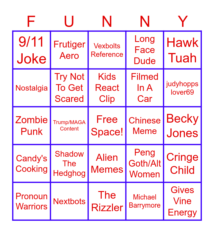 This bingo card has a free space and 29 words: Eye of The Rah, Nextbots, Vexbolts Reference, Seasons Song Meme, Hawk Tuah, 9/11 Joke, Try Not To Get Scared, Kids React Clip, Chinese Meme, Cringe Child, Pronoun Warriors, Trump/MAGA Content, Michael Barrymore, Gives Vine Energy, Zombie Punk, Costco Guys, The Rizzler, Peng Goth/Alt Women, judyhopps lover69, Candy's Cooking, Shadow The Hedghog, Guitar Covers, Filmed In A Car, Becky Jones, Nostalgia, Frutiger Aero, Alien Memes, Long Face Dude and Relatabel meme.