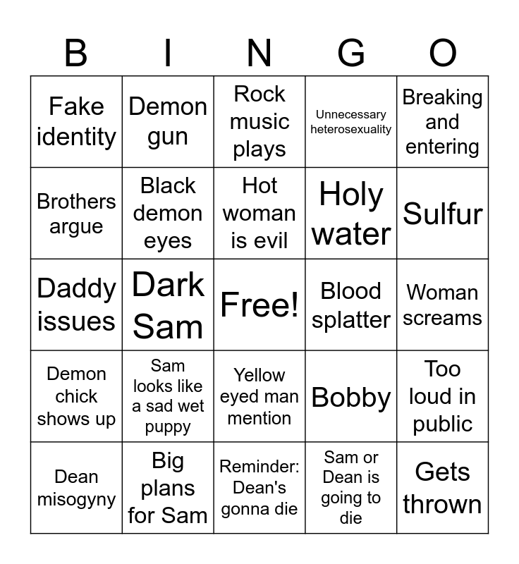 This bingo card has a free space and 24 words: Dean misogyny, Sam looks like a sad wet puppy, Hot woman is evil, Sam or Dean is going to die, Breaking and entering, Fake identity, Demon gun, Rock music plays, Blood splatter, Woman screams, Daddy issues, Black demon eyes, Bobby, Too loud in public, Brothers argue, Big plans for Sam, Reminder: Dean's gonna die, Unnecessary heterosexuality, Sulfur, Demon chick shows up, Dark Sam, Yellow eyed man mention, Holy water and Gets thrown.