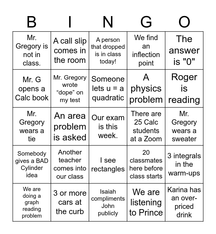 This bingo card has 65 words: Free!, Mr. Gregory says "differential", Super 6 in The Cylinder, 3 integrals in the warm-ups, Discs, yes., "substitution" is spoken, A call slip comes in the room, Bernhard Riemann is referenced, Someone lets u = a quadratic, It says “hip hop” on my exam, I see rectangles, A proof!, Mr. Gregory wears a sweater, The answer is "0", 3 sections of HW in 1 week, Mr. G opens a Calc book, An area problem is asked, Mr. Gregory is not in class., Mario NOT late to class., A physics problem, Another teacher comes into our class, Somebody gives a BAD Cylinder idea, We find an inflection point, Doing Calculus from a table, We are listening to The Beatles, We are listening to go go music, More than 4 people are absent, That is an absolute max!, Our exam is this week., We got 3 of the 5 songs in Jeopardy!, We are doing a graph reading problem, The answer is "undefined", The answer is "1", I see a parabola, 20 classmates here before class starts, 3 or more cars at the curb, A bus is parked outside our room, Mr. Gregory wears a tie, We are listening to Prince, We are listening to the jazz, Mr. Gregory wrote “dope” on my test, Mr. Gregory wrote “fresh” on my test, There are 25 Calc students at a Zoom, You got a volume problem right on a test, One of “The Boys” sits with one of the girls, Elie stands the is entire class, Roger is reading, Both Colin & Collin on-time to class, Karina has an over-priced drink, Samantha does an integral correctly, Ivan answers 2 questions in one class, There are no juniors in class today, Liam asks a good question, Isaiah compliments John publicly, Juli wears a hip hat, Brooklyn asks 2 questions about HW, Angie tries some chocolate, A person that dropped is in class today!, Noah & Luis both ask questions, Jackson: first to finish the warm-ups correctly, 2 people with the same names have switched seats!, Elizabeth & Giselle both have Spanish books, A test tube and Camila sit together, Hana is at a 2-plant table and Anjelica lets u be a trig function.