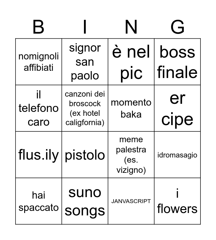 This bingo card has 16 words: suno songs, idromasagio, è nel pic, nomignoli affibiati, flus.ily, signor san paolo, meme palestra (es. vizigno), JANVASCRIPT, il telefono caro, canzoni dei broscock (ex hotel caligfornia), hai spaccato, boss finale, pistolo, er cipe, momento baka and i flowers.
