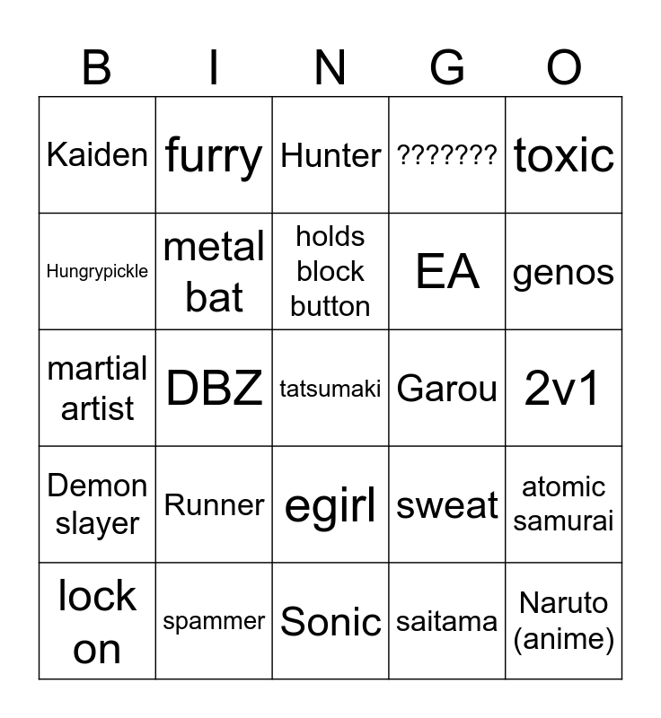 This bingo card has a free space and 24 words: Runner, spammer, holds block button, lock on, toxic, Kaiden, Hungrypickle, furry, Garou, egirl, EA, martial artist, sweat, atomic samurai, metal bat, saitama, 2v1, Hunter, genos, DBZ, Naruto (anime), Demon slayer, ??????? and Sonic.