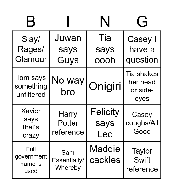 This bingo card has 16 words: Sam Essentially/ Whereby, Casey coughs/All Good, Tia says oooh, Slay/ Rages/ Glamour, Xavier says that's crazy, Juwan says Guys, Felicity says Leo, Maddie cackles, Tom says something unfiltered, No way bro, Full government name is used, Casey I have a question, Harry Potter reference, Tia shakes her head or side-eyes, Onigiri and Taylor Swift reference.