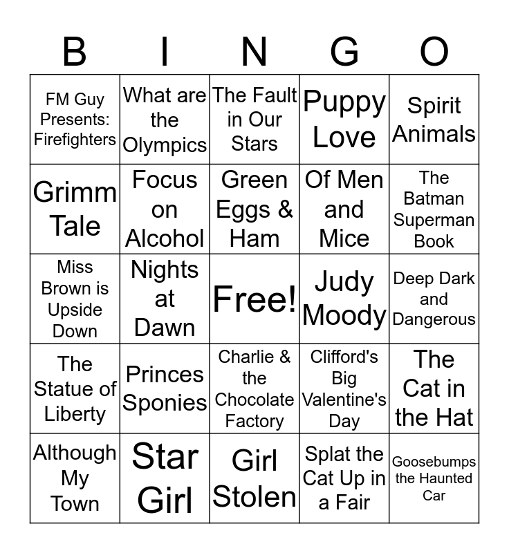 This bingo card has a free space and 71 words: Trouble at the Krusty Krab, What are the Olympics, Diary of a Wimpy Kid, Twelfth Night, Girl Stolen, Warriors Dont Cry, Puppy Love, The Outsiders, Of Men and Mice, Pete the Cat, Although My Town, All the Lovely Bad Ones, The Batman Superman Book, FM Guy Presents: Firefighters, Pav Pilky, Miss Brown is Upside Down, Clifford's Big Valentine's Day, Spirit Animals, Monster High, Deep Dark and Dangerous, Princes Sponies, Goosebumps the Haunted Car, The Cat in the Hat, Percy Jackson LIghtning Theif, One, Spirit Animals, Where is the White House, I Survived the Titanic, Old School, Star Light, Star Girl, The Titanuim Ninja, Splat the Cat Sings Flat, Frog on a Log, Splat the Cat Up in a Fair, Why Should I Help?, The Watsons Go to Birmingham 163, Biscuit Loves the Library, Grimm Tale, Joey Pigza, Charlie & the Chocolate Factory, Who was Milton Hershey, The Statue of Liberty, What was D-Day?, Peter Pan, Dork Diaries, Smoke, Focus on Alcohol, There was an Old Lady Who Swallowed Some Bugs, The Babysitters Club, Hi Fly Guy, Frog and the Toad are Friends, Judy Moody, Smile, Sisters, Mocking Bird, Green Eggs & Ham, Logo City, Hello Olaf, My Big Fat Zombie, Pirates Past Noon, The Hatchet, Nights at Dawn, Rules, The Red Pyramid, Mama Will You Hold my Hand?, The Fault in Our Stars, Haddix Among the Hidden, Chase's Space Case, Fiction and Wednesday Wars.
