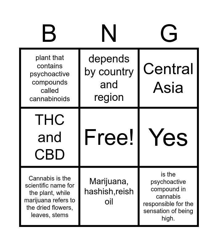 This bingo card has a free space and 10 words: 2800 BC, Marijuana, hashish,reish oil, Central Asia, plant that contains psychoactive compounds called cannabinoids, Yes, Cannabis is the scientific name for the plant, while marijuana refers to the dried flowers, leaves, stems, depends by country and region, is the psychoactive compound in cannabis responsible for the sensation of being high., THC and CBD and Is consumed through smoking, vaporizing, ingestion, or topical application..
